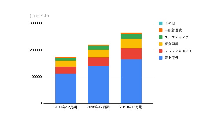 上の図は、eMarketerという海外のリサーチメディアによる2017年から2023年までのEC市場の展望を示したグラフです。 EC市場自体の成長が止まるという見通しではないものの、4%前後の横ばいの成長が続く見通しが立てられており、急激な成長が見込まれる市場ではないことがわかります。 このようなデータから、仮にAmazonがECのみにフォーカスしたビジネスモデルを続けた場合、持続的な成長をこれまでのペースで続けることは難しいことが推測されます。 ④Amazonのコスト構造 ④-1 Amazonの販売管理費