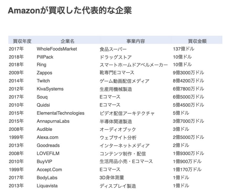 以下の図は、Amazonがこれまで1億ドル以上で買収した企業の一覧です。 特に2009年に行った靴専門のEC企業Zapposの買収や2017年に買収した高級スーパーWhole Foods Marketの買収はメディアでも注目され大きな話題となりました。