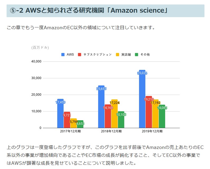 上のグラフは一度登場したグラフですが、このグラフを出す前後でAmazonの売上あたりのEC系以外の事業が増加傾向であることやEC市場の成長が鈍化すること、そしてEC以外の事業ではAWSが顕著な成長を見せていることについて説明しました。 Amazon AWSとは