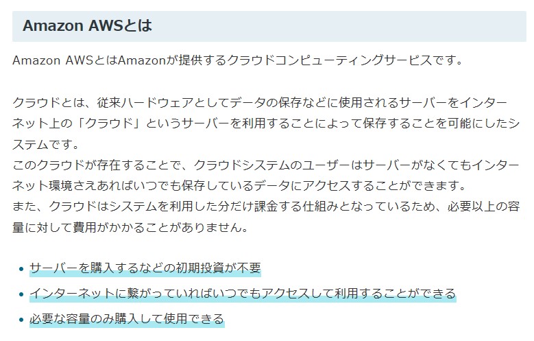 このサービスは、クラウドコンピューティングというインターネットにアクセスするだけで使うことのできるサーバーを提供するサービスです。従来のサーバーに比べ、低コストで運用できるため、多くの企業で導入されています。