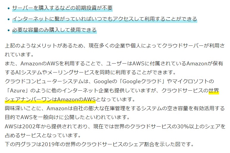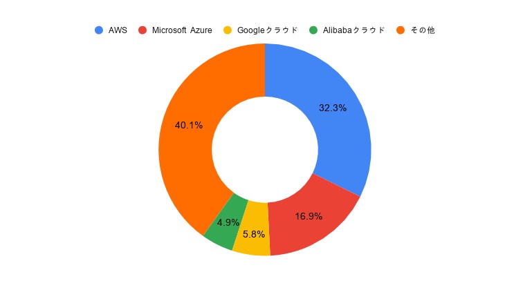 上記のようなメリットがあるため、現在多くの企業や個人によってクラウドサーバーが利用されています。 また、AmazonのAWSを利用することで、ユーザーはAWSに付属されているAmazonが保有するAIシステムやメーリングサービスを同時に利用することができます。 クラウドコンピューターシステムは、Googleの「Googleクラウド」やマイクロソフトの「Azure」のように他のインターネット企業も提供していますが、クラウドサービスの世界シェアナンバーワンはAmazonのAWSとなっています。 興味深いことに、Amazonは自社の膨大な在庫管理をするシステムの空き容量を有効活用する目的でAWSを一般向けに公開したといわれています。 AWSは2002年から提供されており、現在では世界のクラウドサービスの30%以上のシェアを占めるサービスとなっています。 下の円グラフは2019年の世界のクラウドサービスのシェア割合を示した図です。
