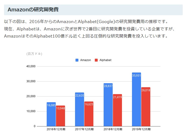 以下の図は、2016年からのAmazonとAlphabet(Google)の研究開発費用の推移です。 現在、Alphabetは、Amazonに次ぎ世界で2番目に研究開発費を投資している企業ですが、AmazonはそのAlphabet100億ドル近く上回る圧倒的な研究開発費を投入しています。 研究開発費