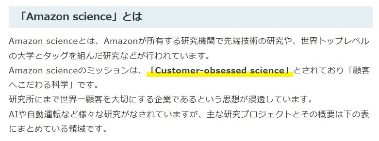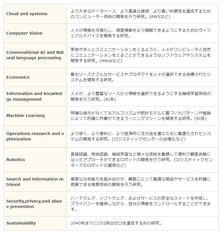 Amazon scienceとは、Amazonが所有する研究機関で先端技術の研究や、世界トップレベルの大学とタッグを組んだ研究などが行われています。 Amazon scienceのミッションは、「Customer-obsessed science」とされており「顧客へこだわる科学」です。 研究所にまで世界一顧客を大切にする企業であるという思想が浸透しています。 AIや自動運転など様々な研究がなされていますが、主な研究プロジェクトとその概要は下の表にまとめている領域です。 Cloud and systems より大きなデータベース、より高速な接続、より高い利便性を達成するためのコンピューター技術の開発を行う研究。(AWSなど) Computer Vision 人々が情報を可視化し、視覚情報をより理解できるようにするためのヴィジュアルデバイスを開発する研究。 Conversational AI and Natural language processing 家族や友人とコミュニケーションをとるように、人々がコンピュータと自然にコミュニケーションをとることができるようなソフトウェアやシステムを開発する研究。(Alexaなど) Economics 最もリーズナブルなサービスやプロダクトを人々が選択できる洗練されたシステムを開発する研究。 Information and knowledge management 人々が、より豊富なソースから情報を選択できるようにする機械学習技術の開発を行う研究。(AI系) Machine Learning 明確な指示がなくてもアルゴリズムや統計モデルに基づいたパターンや推論によって的確に作業ができるラーニングマシーンを開発する研究。(AI系) Operations research and optimization より早く、より便利に、より経済的に注文品を運ぶために最適化されたシステムの開発する研究。(ロジスティックセンターの合理化など) Robotics 言語認識、物体認識、機械学習など様々な技術を集積して便利で顧客体験に沿ったアプローチができるロボットの開発を行う研究。(ロジスティックセンターでのロボットの運用など) Search and information retrieval 高度な分析能力を組み合わせ、顧客にとって最適な商品やサービスを的確に提案できる検索技術の開発を行う研究。 Security,privacy,and abuse prevention ハードウェア、ソフトウェア、およびサービスの安全なスイートを作成し、プライバシーを確保しながら、自分の情報をコントロールすることができます。 Sustainability 2040年までにCO2排出ゼロを達成するめの研究。