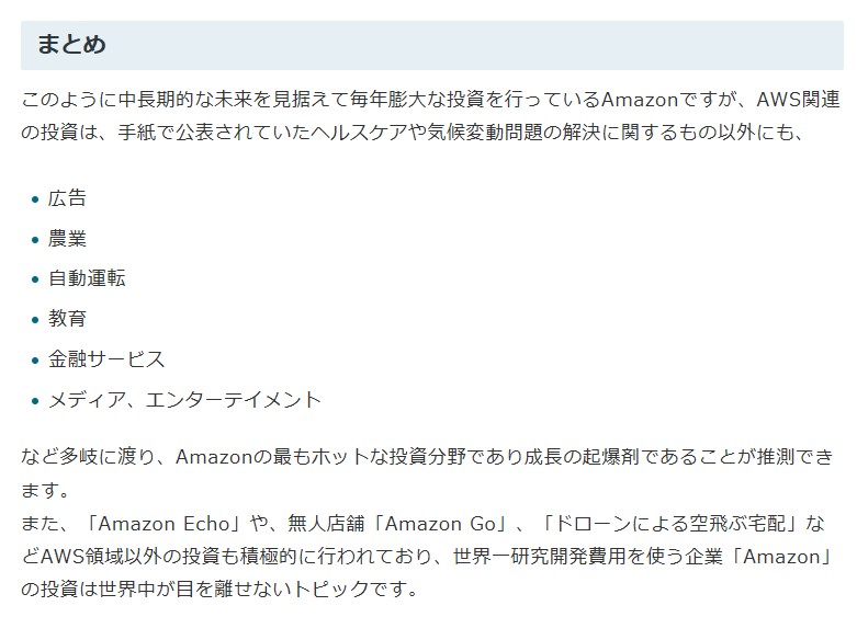 このように中長期的な未来を見据えて毎年膨大な投資を行っているAmazonですが、AWS関連の投資は、手紙で公表されていたヘルスケアや気候変動問題の解決に関するもの以外にも、