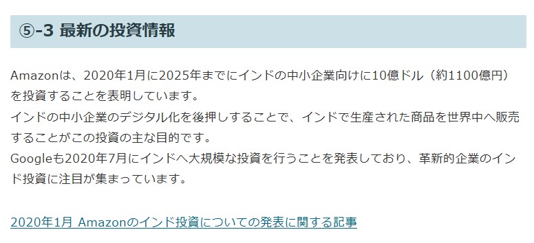 Amazonは、2020年1月に2025年までにインドの中小企業向けに10億ドル(約1100億円)を投資することを表明しています。 インドの中小企業のデジタル化を後押しすることで、インドで生産された商品を世界中へ販売することがこの投資の主な目的です。 Googleも2020年7月にインドへ大規模な投資を行うことを発表しており、革新的企業のインド投資に注目が集まっています。