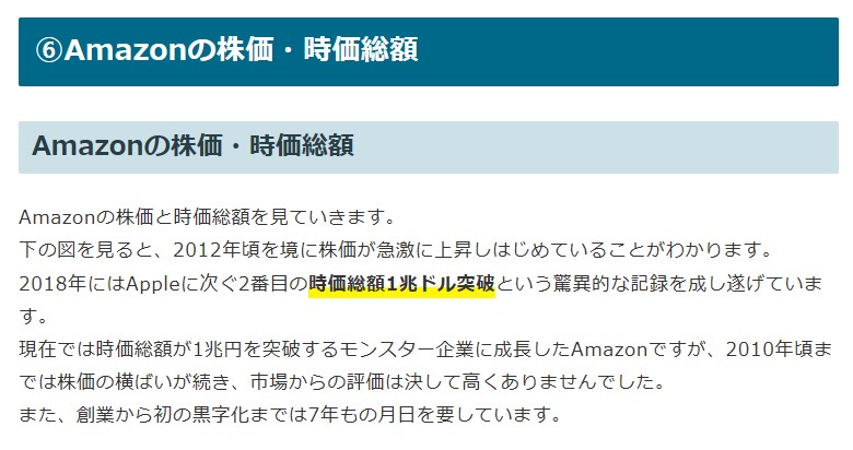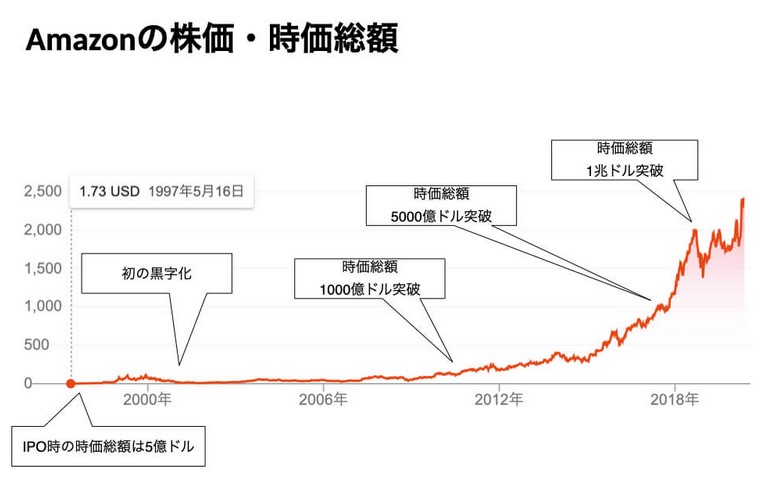 Amazonの株価と時価総額を見ていきます。 下の図を見ると、2012年頃を境に株価が急激に上昇しはじめていることがわかります。 2018年にはAppleに次ぐ2番目の時価総額1兆ドル突破という驚異的な記録を成し遂げています。 現在では時価総額が1兆円を突破するモンスター企業に成長したAmazonですが、2010年頃までは株価の横ばいが続き、市場からの評価は決して高くありませんでした。 また、創業から初の黒字化までは7年もの月日を要しています。 Amazonの株価・時価総額