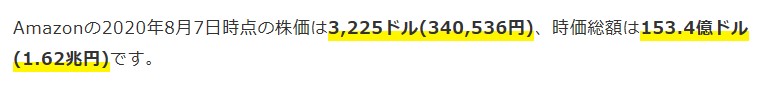 Amazonの2020年8月7日時点の株価は3,225ドル(340,536円)、時価総額は153.4億ドル(1.62兆円)です。 Amazonの初期のファイナンス