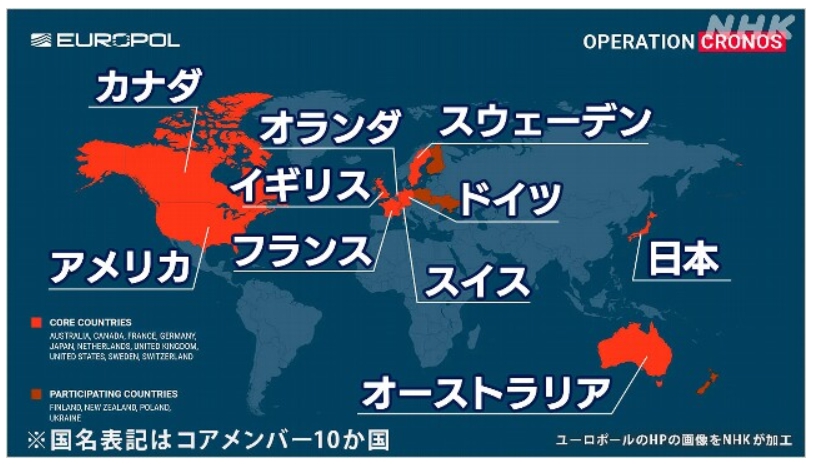これは「Operation Cronos=オペレーション・クロノス」と名付けられた国際捜査で、日本やアメリカのFBIなど10か国の法執行機関が参加しています。
