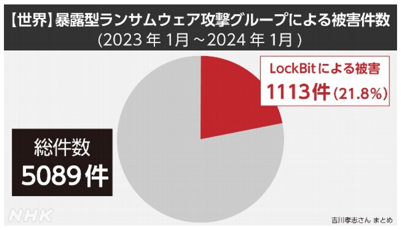 去年1月からことし1月までの1年あまりで攻撃を受けた可能性があるのは5089件で、このうち、ロックビットによるものは1113件に上ります。