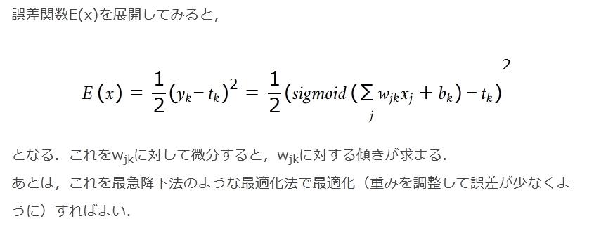 あとは,これを最急降下法のような最適化法で最適化(重みを調整して誤差が少なくように)すればよい.