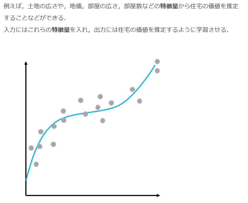 例えば,土地の広さや,地価,部屋の広さ,部屋数などの特徴量から住宅の価値を推定することなどができる.