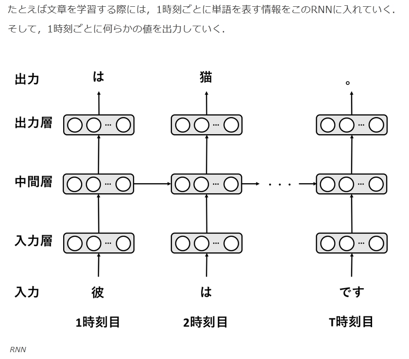 たとえば文章を学習する際には,1時刻ごとに単語を表す情報をこのRNNに入れていく. そして,1時刻ごとに何らかの値を出力していく.