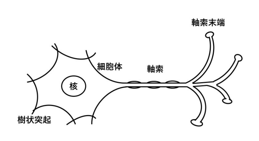 末端は軸索末端(Axon terminals)と呼ばれ枝分かれしている. この末端部分が他の神経細胞の樹状突起に接続する. この接合部分をシナプスと呼ぶ.