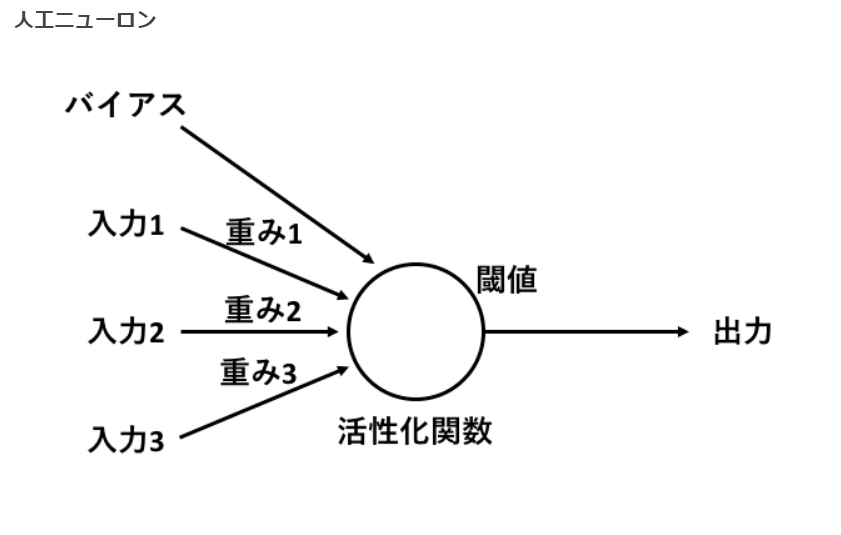 人間の脳のニューロンと同様に他のニューロンからの入力を受け取り,それを処理して(実際には結合強度を掛けて足し合わせる),閾値(これを超えたら出力するという値)を超えたら出力をする.
