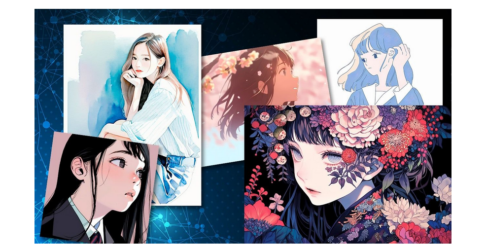 バナー画像:有料の画像素材サイトPIXTAで、「生成AI」で検索をかけて表示される画像の数々。圧倒的に女性の画像が多いが、さまざまなタッチのものがあり、いわゆる「プロ」の作品と遜色ないクオリティがある(PIXTAの画像をニッポンドットコム編集部でコラージュ)