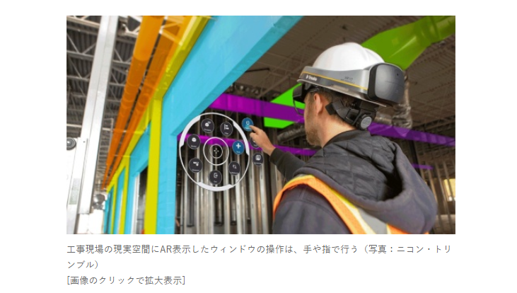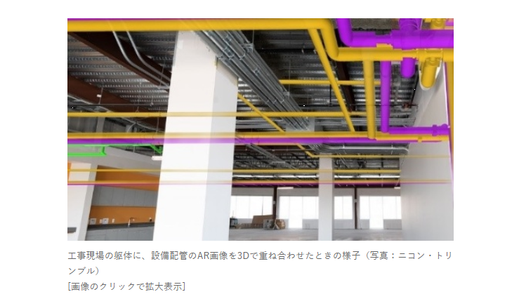 設計者と施工者の間で図面の整合性を3D画像で確認したり、施工の関係者同士で合意形成がしやすくなるという。例えば、鉄骨などの躯体(くたい)や仕上げといった建築工事と、配管などの設備工事において、現実空間に3DのAR画像を重ねて表示。躯体と設備が相互に干渉していないかを現場で確認しやすくなる。施工前に現場担当者が3Dモデルを見ながら、空間の把握や課題の抽出をするといった用途にも使える。』