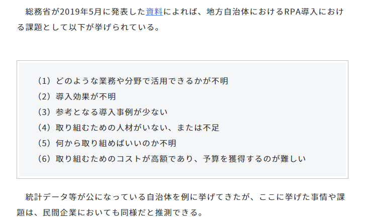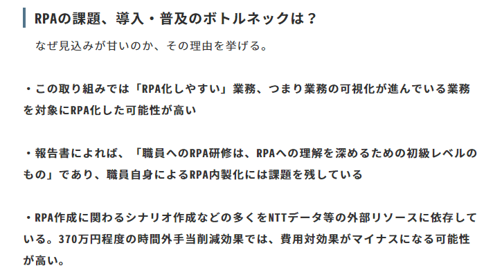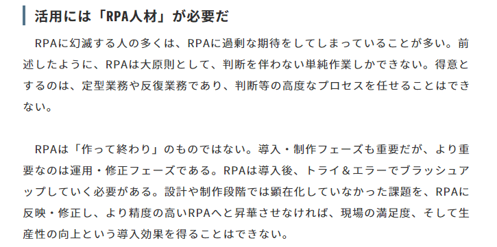ソフトウエアロボが代行する作業の多くは、単純作業だけれどもシステム化できなかった領域だから、目先の業務の効率化への貢献度は大きい。人海戦術でデータ入力などをしてきた企業では、コンピューター黎明期のシステム導入に匹敵するくらいの効果があったりする。だから、業務の変革でも何でもないのに「我が社のDX(デジタルトランスフォーメーション)の成果だ」と悪ノリする経営者は多い。しかも、既存のシステムだけでなくRPAで業務を二重にブラックボックス化する恐ろしさに気づいていないのだ。
