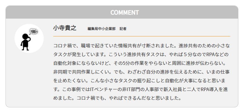 ちなみにRPAによる業務のブラックボックス化の場合、そもそも初めから中の人がいない。RPAの導入前にデータの入力業務などを担っていた人は、派遣など非正規雇用の人が多く、RPA導入から時を置かずにいなくなってしまう。正規雇用の従業員も別の業務に就くから中の人ではない。RPA導入を支援した技術者も中の人を続けることはない。かくして中の人がいないままソフトウエアロボは動き続ける。さて将来、何が起こるか。乞うご期待、である。