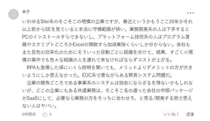 さて、いかがだったであろうか。この「極言暴論」ではブラックボックス化問題を何度か取り上げているが、今回は「中の人問題」の観点でまとめてみた。結局のところ、企業が何もしなくても、いつまでも中の人として献身的に尽くしてくれる技術者やITベンダーなどいないということだ。付加価値の少ない基幹系システムにはITベンダーに中の人が大勢いるパッケージソフトウエアやクラウドなどをそのまま使い、どうしても独自システムが必要ならば自社で中の人を育てるしかない。そう思うが、いかがか。』