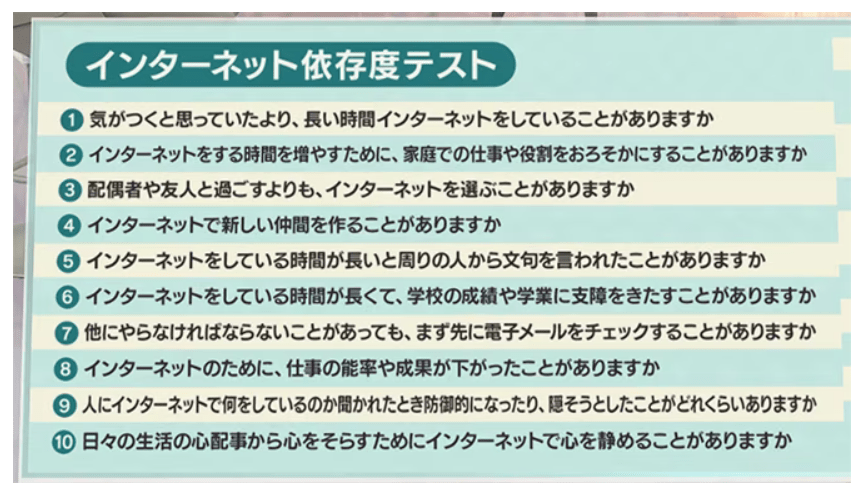 久里浜医療センターではネット依存の度合いをチェックするために20項目からなるスクリーニングテスト「インターネット依存度テスト(IAT)」を行っています。