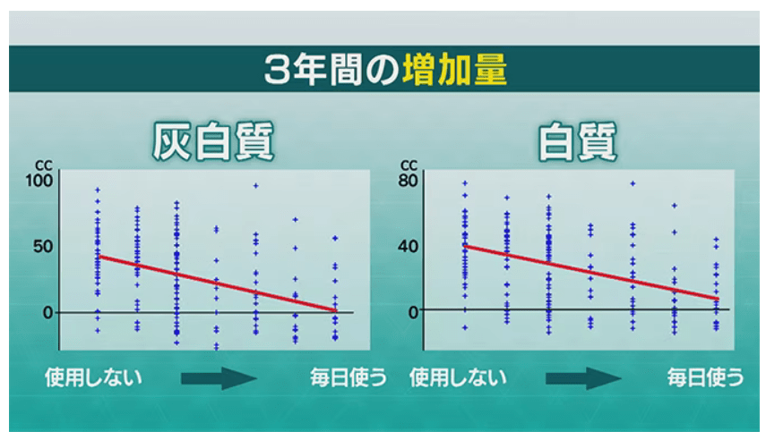 そこで脳の認知機能を担う「灰白質」と情報処理能力に関わる「白質」の体積の3年間の増加量を調べたところ、インターネットを利用する頻度が高い子どもほど灰白質も白質も増加量が少ないことがわかりました。特に思考や記憶、コミュニケーションに大事なはたらきを持つ、前頭葉の「前頭前野」での成長の差が大きいことも明らかになりました。