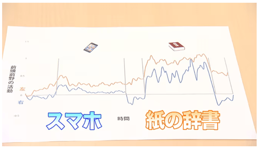 血流を比較すると、スマホを使った時よりも、紙の辞書を使った時の方が右脳でも左脳でも脳活動が高くなっていることが分かりました。