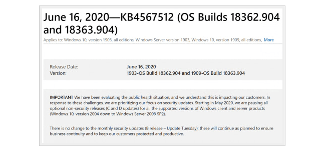 この変更については、後述するMicrosoftの公式ドキュメント「What’s new in Windows 10, version 2004 for IT Pros」の「Windows Update for Business」の項に2020年6月24日(米国時間)に追記されました。2019年から機能更新プログラムの自動配布はサポート終了が近いデバイスのみを対象とするように方針が変更され、自動更新に任せている多くのデバイスでは年に1回程度の機能更新(HomeやProは3年の間に2回)しか行われなくなりました。この方針変更を最大限ユーザーに提供しつつ、かつ混乱を避けるために、「詳細オプション」から削除されたそうです。』