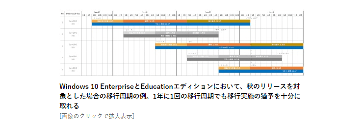 ライフサイクルに関する FAQ – Windows https://docs.microsoft.com/ja-jp/lifecycle/faq/windows Windows 10 EnterpriseとEducationエディションは大量の端末を抱える企業や教育機関で利用されていることが多い。これらのユーザーはアプリケーションやドライバーの互換性検証、新バージョンへの移行計画などに多くの時間を費やしており、移行の周期をなるべく長くしたいと考えている。