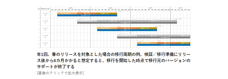Windows 10 EnterpriseとEducationエディションにおいて、秋のリリースを対象とした場合の移行周期の例。1年に1回の移行周期でも移行実施の猶予を十分に取れる [画像のクリックで拡大表示]