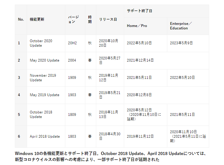 緊急! Windows 10 May 2020 Updateのアップグレードにちょっと待った!(本連載 第181回:緊急特別編) この機能はWindows 10 バージョン1803や1809にも備わっていますが(2019年5月以降の品質更新で追加されました)、これらのバージョンのライフサイクルは既に終了しているか、終了が近づいているため、自動配布される可能性はあります。Windows 10 バージョン1809のHomeおよびProエディションのサポート期限は「2020年5月12日」でしたが、コロナ禍の影響で「2020年11月10日」まで延期されました。Windows Updateがその延期を考慮してくれるのかどうかは、筆者は確認できていません。