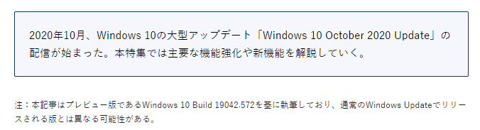 Windows 10 EnterpriseとEducationエディションのユーザーには、より長いサポート期間が提供されるので、その多くは秋の機能更新をターゲットとして移行を計画し、実施するようになっていくと考えられる。October 2020 Updateは新機能が少なく、サイズも小さな機能更新ではあるが、毎回の移行に悩んでいるユーザーにとっては、大きなリリースと言える。』