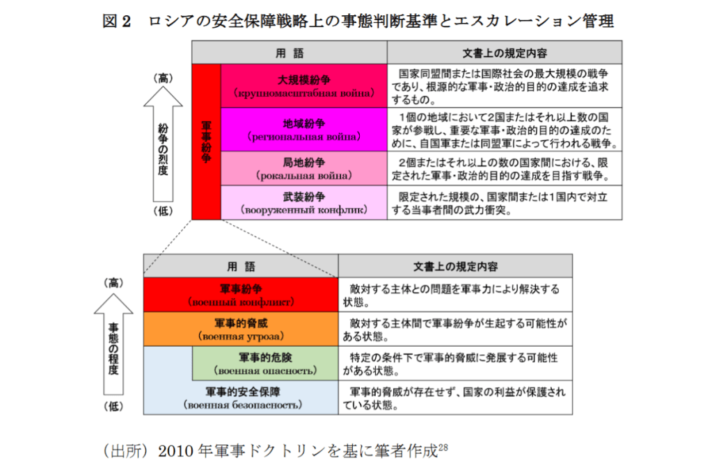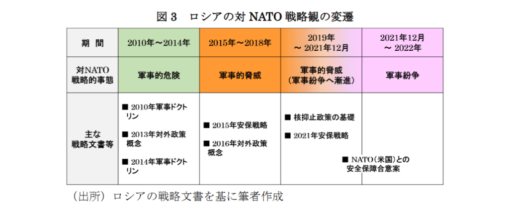 58 “B o6nj;nx HHTepecax chh3htb HanpaaceHHOCTb : KaK Poccmh npe且jiaraeT CIIIA h HATO BbiCTpanBaTb OTHOineHna b c(j)epe 6e3011acHOCTH,” December 18, 2021, httpsV/russian.rt.com/world/article/939702-rossiya-ssha-dokumenty- bezopasnost/amp (Accessed on March 23, 2022). 59 NATO HQ, 4<NATO-Russia Council meets in Brussels,January 12, 2022, https7/www.nato.int/cps/en/natohq/news_190643.htm(Accessed on March 23, 2022). 60 NATO HQ, “Press conference by NATO Secretary General Jens Stoltenberg following the meeting of the NATO-Russia Council,January 12, 2022, https7/www.nato.int/cps/en/natohq/opinions_190666.htm (Accessed on March 25, 2022). 61″HaM hto, BoeeaTb c 6jiokom HATO?,” IlyTHH nefloeojieH otbctom 3ana^a Ha TpedoBaHHH Poccnu,” February 1,2022 (Accessed on March 25, 2022). 62 Patricia Lewis, ‘”Russian treaty proposals hark back to post-Cold War era,” https://www.chathamhouse.org/2021/12/russian-treaty-proposals-hark-back- post-cold-war-era (Accessed on July 20, 2022). 63 「ウクライナ侵攻直前 プーチン大統領演説全文」『NHKNEWSWEBJ 2022 年 3月 4 日、https7/www3.nhk.or.jp/news/html/20220304/kl0013513641000. html(2022年5月9日アクセス)。 64 Me^Be且eB, “BoeHHa^ HOKTpuHa Pocch就cK〇ii ①eaepaRHu.”なおプーチン大統 領は2022年5月9日時点で、引き続きウクライナ侵攻を「特別軍事作戦」と称し ている。筆者はこれが同戦略文書上で「限定された規模の1国内で対立する当事 者間の武力衝突」と定義される、武装紛争に近い位置づけにあるものと考える。 11