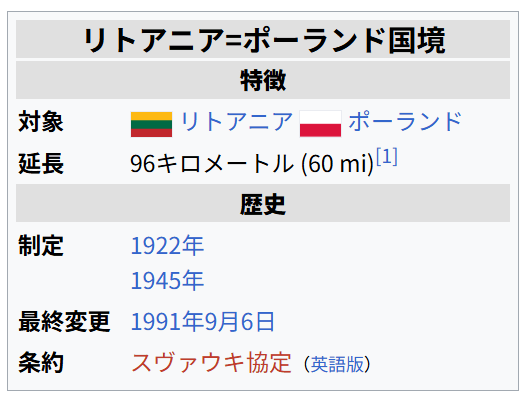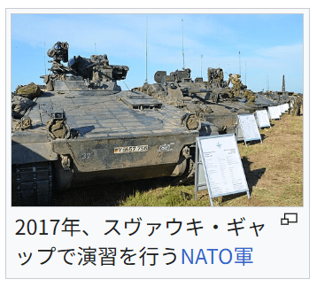 ^ a b “The Suwalki Gap: The Most Vulnerable Stretch of Land in Europe”. TIME (2017年3月25日). 2022年3月8日閲覧。 ^ “Suwalki Gap”. GlobalSecurity.org. 2022年3月8日閲覧。 ^ “LR AT AKTO Dėl Lietuvos nepriklausomos valstybės atstatymo signatarai”. Lietuvos Respublikos Seimas. 2022年3月6日閲覧。[リンク切れ] ^ Peter Andreas; Timothy Snyder (1 January 2000). The Wall Around the West: State Borders and Immigration Controls in North America and Europe. Rowman & Littlefield. p. 187. ISBN 978-0-7425-0178-2 ^ Yaël Ronen (19 May 2011). Transition from Illegal Regimes under International Law. Cambridge University Press. p. 138. ISBN 978-1-139-49617-9 ^ Polska w cyfrach[リンク切れ] [in:] E. Romer Atlas Polski współczesnej, 1928[リンク切れ]. ^ Michael Brecher (1997). A Study of Crisis. University of Michigan Press. pp. 252–255. ISBN 0-472-10806-9 ^ Halina Lerski (19 January 1996). Historical Dictionary of Poland, 966–1945. ABC-CLIO. p. 308. ISBN 978-0-313-03456-5 ^ Stephen R. Burant and Voytek Zubek, Eastern Europe’s Old Memories and New Realities: Resurrecting the Polish–Lithuanian Union, East European Politics and Societies 1993; 7; 370, online ^ “Lietuvos Respublikos ir Lenkijos Respublikos sutartis dėl bendros valstybės sienos, su ja susijusių teisinių santykių, taip pat dėl bendradarbiavimo ir abipusės pagalbos šioje srityje” Treaty between the Republic of Lithuania and the Republic of Poland on the common state border, legal relations connected therewith, and on the cooperation and mutual assistance in this field. Office of the Seimas of the Republic of Lithuania (1996年3月5日). 2022年3月6日閲覧。 ^ a b “NATO Must Prepare to Defend Its Weakest Point—the Suwalki Corridor”. FP (2022年3月3日). 2022年3月8日閲覧。 ^ “NATOが警戒するポーランド・バルト3国間の国境封鎖”. 日経ビジネス (2022年2月4日). 2022年3月6日閲覧。 ^ Sytas, Andrius (2017年6月18日). “NATO war game defends Baltic weak spot for first time”. Reuters 2022年3月6日閲覧。 ^ a b “迫るロシアの脅威、バルト3国の悲劇再来を防げ”. 日経ビジネス (2017年7月26日). 2022年3月7日閲覧。 ^ a b “ロシア、NATOの弱点「スヴァウキ・ギャップ」近くに軍事拠点を展開”. Business Insider Japan (2018年8月8日). 2022年3月6日閲覧。 ^ “ATO国防相理事会、米国のミサイル防衛計画について協議”. AFP (2007年7月21日). 2022年3月8日閲覧。 ^ “15年前に発せられていたプーチンのNATO、アメリカに対する“ぶちギレ”演説”. デイリー新潮 (2022年3月4日). 2022年3月30日閲覧。 ^ 小泉悠 (2013年12月17日). “ロシア、欧州に短距離弾道ミサイルを配備:「戦略的安定」を巡る米露の角逐”. Yahoo News 2022年3月30日閲覧。 ^ “NATOミサイル防衛ロシアの強硬姿勢”. Wedgeinfinity (2012年5月29日). 2022年3月30日閲覧。 ^ “ロシア、カリーニングラードに弾道ミサイル NATO諸国反発”. AFP (2016年10月9日). 2022年3月8日閲覧。 ^ “ロシア、インドヘのミサイル供給開始 米は制裁発動か”. Reuters (2021年11月15日). 2022年3月7日閲覧。 ^ “Lukashenko’s dangerous game could leave him broke”. bne IntelliNews (2022年2月21日). 2022年3月29日閲覧。 ^ “Germany To Bolster Troop Presence In Lithuania To Counter Russian Aggression”. RepublicWorld.com (2022年2月7日). 2022年3月29日閲覧。 ^ “ロシア、ベラルーシで大規模演習 ウクライナも対抗、緊張高まる”. jiji.com (2022年2月10日). 2022年3月30日閲覧。 ^ “Die „Lücke von Suwalki“ ist die Achillesferse der Nato” (ドイツ語). WELT (2016年7月9日). 2022年3月29日閲覧。 ^ “ポーランド、ベラルーシ国境で移民流入を阻止 双方が非難の応酬”. BBC (2021年11月9日). 2022年3月9日閲覧。 ^ “EU、移民の「ハイブリッド攻撃」に危機感”. 産経新聞 (2021年11月16日). 2022年3月9日閲覧。 ^ “ベラルーシ、EUへのガス供給停止を示唆 国境の移民問題めぐり”. BBC (2021年11月12日). 2022年3月7日閲覧。 ^ “移民も動物も遮るポーランドの壁 世界遺産の森を破壊”. NIKKEI STYLE (2022年2月26日). 2022年3月9日閲覧。 ^ “ドイツ、ウクライナへの武器供与決定 慎重姿勢を転換”. Reuters (2022年2月27日). 2022年3月8日閲覧。 ^ “【ウクライナ侵攻軍事シナリオ】ロシア軍の破壊的ミサイルがキエフ上空も圧倒し、西側は手も足も出ない”. Newsweek (2022年1月21日). 2022年3月13日閲覧。 ^ “アメリカがシリアを攻撃 —— 対抗するロシアの高性能最新ミサイル防衛システムS-400とは”. Business Insider Japan (2018年4月14日). 2022年3月13日閲覧。 ^ “ロシア・ベラルーシ急接近 米欧、ミサイル誤射や核警戒”. 日本経済新聞 (2022年2月11日). 2022年3月7日閲覧。 ^ Kancelaria Sejmu RP. “Internetowy System Aktów Prawnych”. sejm.gov.pl. 2022年3月6日閲覧。 ^ Stephen Kabera Karanja (January 2008). Transparency and Proportionality in the Schengen Information System and Border Control Co-Operation. Martinus Nijhoff Publishers. p. 39. ISBN 978-90-04-16223-5 ^ “Europe’s border-free zone expands”. BBC News. (2007年12月27日) 2022年3月6日閲覧。 ^ “Nowe polsko-litewskie drogi po wejściu do Schengen” (ポーランド語). DELFI (2012年7月28日). 2022年3月6日閲覧。 ^ “Wspólne patrole na polsko-litewskiej granicy :: społeczeństwo” (ポーランド語). Kresy.pl (2011年12月8日). 2022年3月6日閲覧。 ^ “Przemyt papierosów przy polsko – litewskiej granicy [ZDJĘCIA]” (ポーランド語). bialystok (2015年5月15日). 2022年3月6日閲覧。 関連項目 GIUKギャップ フルダギャップ(英語
