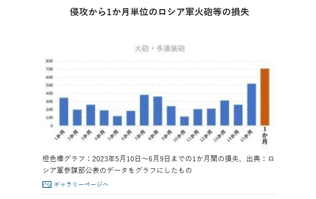 侵攻から1か月単位のロシア軍火砲等の損失 橙色棒グラフ:2023年5月10日~6月9日までの1か月間の損失、出典:ロシア軍参謀部公表のデータをグラフにしたもの ギャラリーページへ