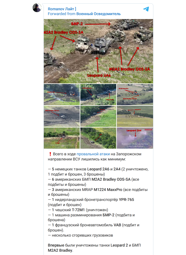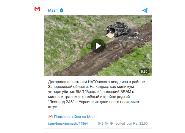 ⚡️One of the disabled Leopard 2 as a result of the Ukrainian counteroffensive in Zaporizhia pic.twitter.com/EKvZfA7a1f
