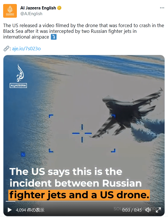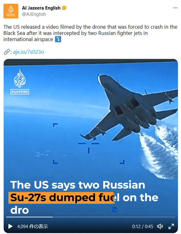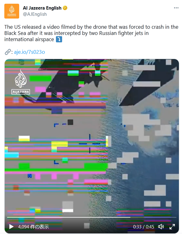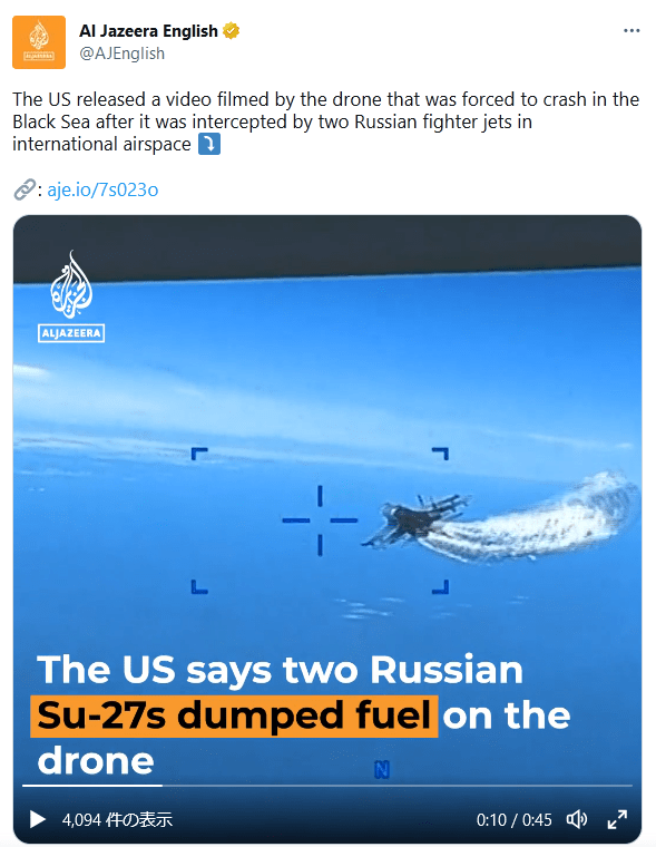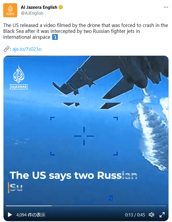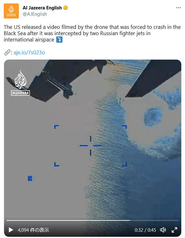 国際法違反は違反として教条主義的にロシア側が批判されるのか、もしくはアメリカは何を言っているのだ?もう戦争やってんだ、黒海に爆装した敵国機を撃墜するのは当然だろ。とアメリカが反感買うのか。