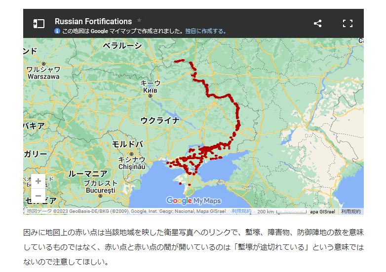 下記のGoogleMap(Brady Africkという方が作成したもの)は衛星画像で確認された塹壕、障害物、防御陣地が落とし込まれたもので、表示に時間がかかるかもしれないが興味がある方は見てみて欲しい。