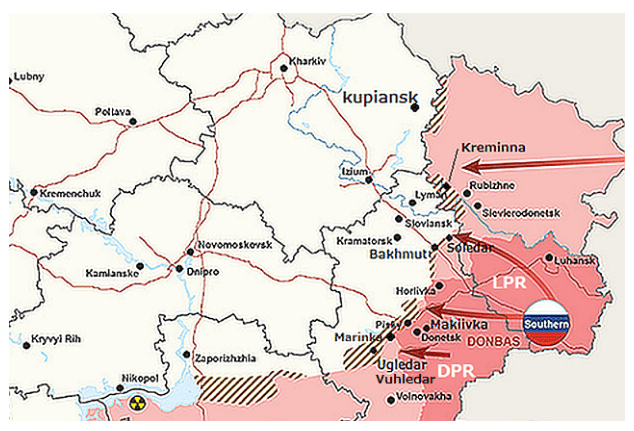すでにM03号線道路に近いオリホヴォ・ヴァシリフカがロシア軍に攻撃されていますが、バフムト包囲戦、市街の掃討戦が完了すれば、さらにミンキフカやザリズニャンスキーに、戦車旅団や空挺師団、ワグネル社の部隊を回して、スラビヤンスクを目指して一気に北上することも考えられます。チャシブ・ヤールは迂回もできます。