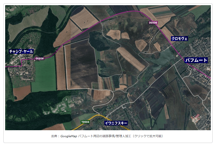 ここを落とされるとウクライナ軍は車輌でバフムート市内にアクセスするのが困難になり、軍用トラックや商用車での物資輸送や相当厳しくなるだろう。