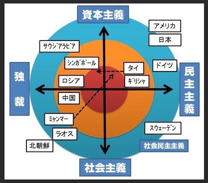 ※ この図は、上記の論文中にあったものでは無いが、検索中に見つけて、参考になるんでキャプチャした…。国家体制を、「民主主義vs.独裁」「資本主義vs.社会主義」という軸で斬ったものだ…。