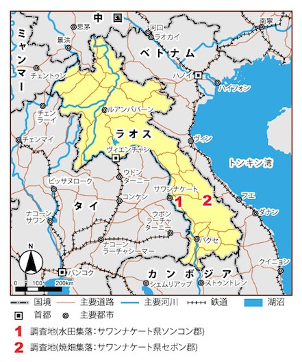 ラオス中南部(右図)のサワンナケート県ソンコン郡で自給的な天水田を営む「調査地1」およびセポン郡で自給的な焼畑を営む「調査地2」を選定しました。生業形態の違いから両地域を比較することも試みました。