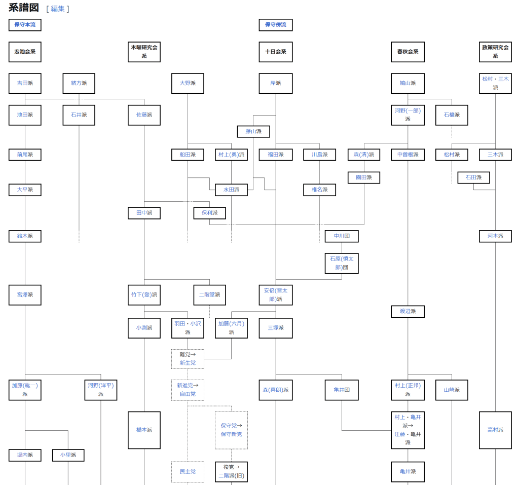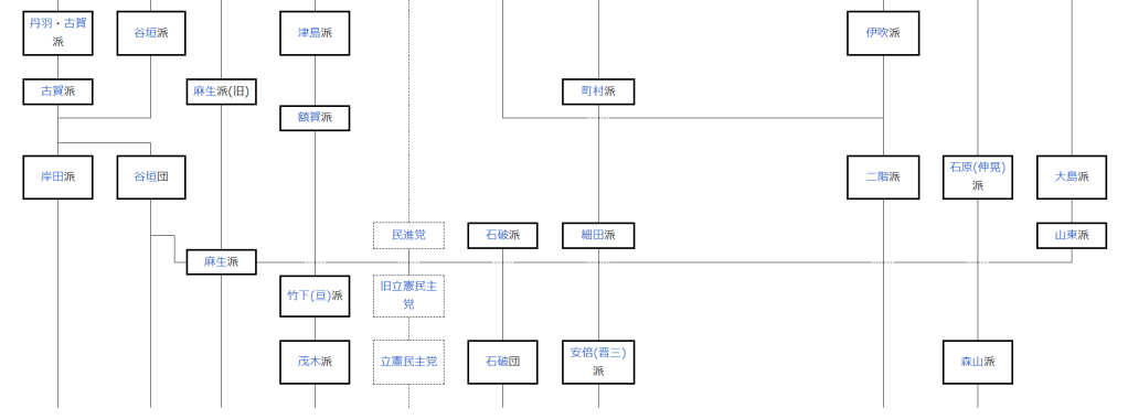 「宏池会」池田派→前尾派→大平派→鈴木派→宮澤派→「木曜研究会」加藤派(「大勇会」河野グループ→「為公会」麻生派→「志公会」【麻生派】)(「木曜研究会」小里派→谷垣派→古賀派に合流×)→「新財政研究会」堀内派→丹羽・古賀派→古賀派→「宏池政策研究会」古賀派→岸田派→×(「有隣会」谷垣グループ→×)
