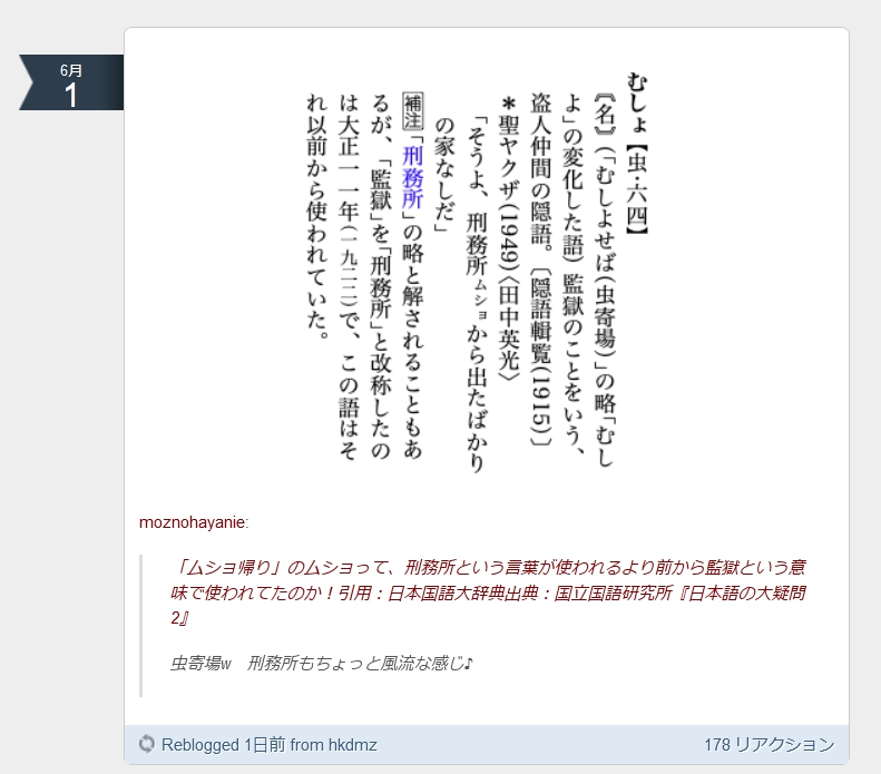 “「ムショ帰り」のムショって、刑務所という言葉が使われるより前から監獄という意味で使われてたのか! 引用:日本国語大辞典 出典:国立国語研究所『日本語の大疑問2』虫寄場w 刑務所もちょっと風流な感じ♪ ”』