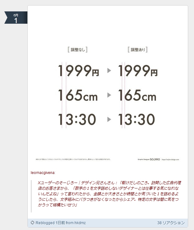 訪問した広告代理店のお客さまから、「数字の1を文字詰めしないデザイナーとは仕事する気になれないんだよね」って言われたから、金額とか大きさとか時間とか気づいた1を詰めるようにしたら、文字組みにバラつきがなくなったからシェア。