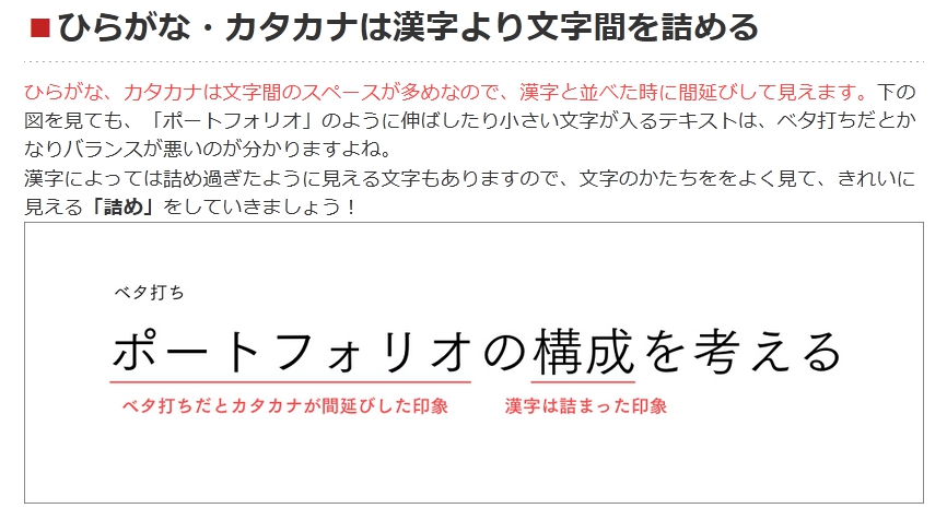 ひらがな、カタカナは文字間のスペースが多めなので、漢字と並べた時に間延びして見えます。下の図を見ても、「ポートフォリオ」のように伸ばしたり小さい文字が入るテキストは、ベタ打ちだとかなりバランスが悪いのが分かりますよね。