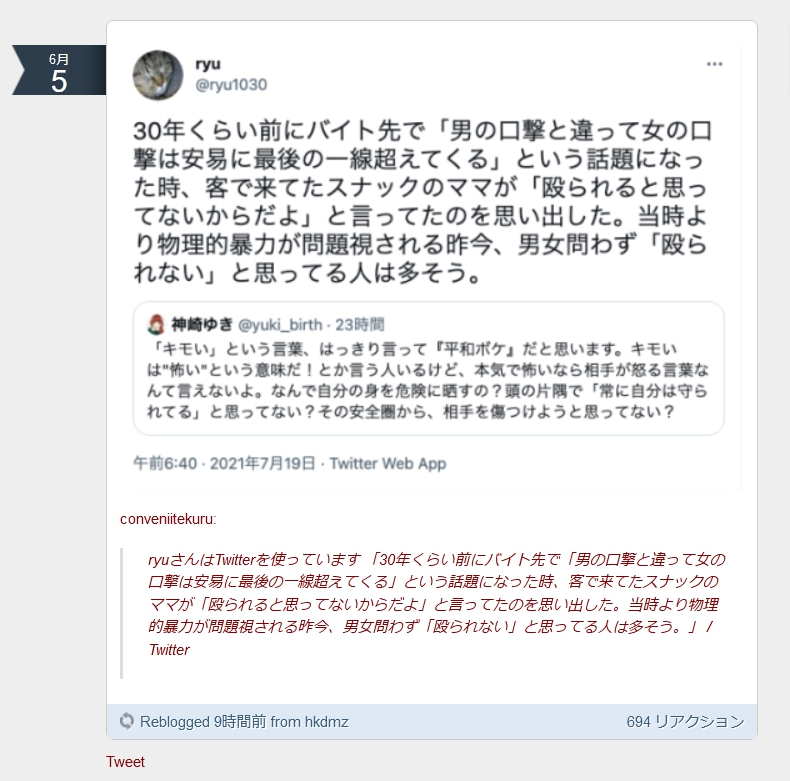 『30年くらい前にバイト先で「男の口撃と違って女の口撃は安易に最後の一線超えてくる」という話題になった時、客で来てたスナックのママが「殴られると思ってないからだよ」と言ってたのを思い出した。当時より物理的暴力が問題視される昨今、男女問わず「殴られない」と思ってる人は多そう。』