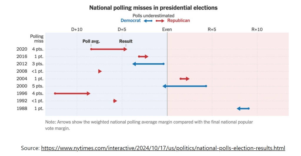 だが、投票日直前での世論動向調査では、トランプ氏がわずかながら優位かほぼ横並びの状態から抜け出せなかった。